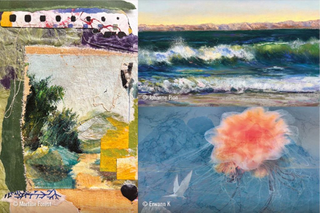 Des paysages marins, issus de la rencontre de l’aquarelle et du monotype, rappellent la beauté et l’importance de la biodiversité des océans. Derrière des apparences de tranquillité se cache une menace constante que l’artiste dénonce : la pollution marine.