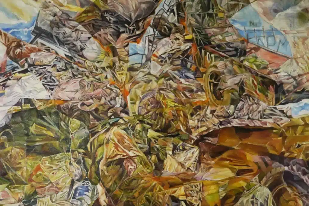 La proposition picturale d’Hervé Mbelo s’appuie sur des réalités observées et des images glanées sur le Web, révélant des environnements profondément modifiés par l’impact du capitalisme, exacerbé par la mondialisation et ses excès. Ces excès incluent la surexploitation des ressources naturelles, l’érosion, la déforestation, la pollution et l’utilisation abusive des nouvelles technologies.