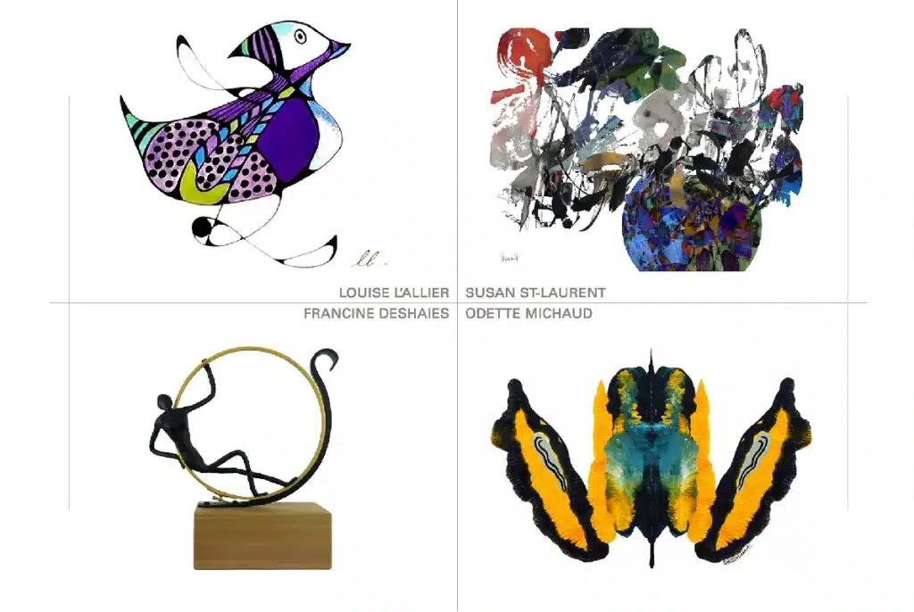 Quatre artistes bouchervilloises vous proposent une mise en commun de leurs univers créatifs, témoignant de leur travail le plus récent. La proposition réunie les sculptures de personnages de Francine Deshaies et les formes surréalistes d’Odette Michaud, un voyage dans l’univers fantaisiste de Louise L’Allier, ainsi que la signature abstraite unique de Susan St-Laurent, qu’elle déploie dans un éventail d’estampes numériques.