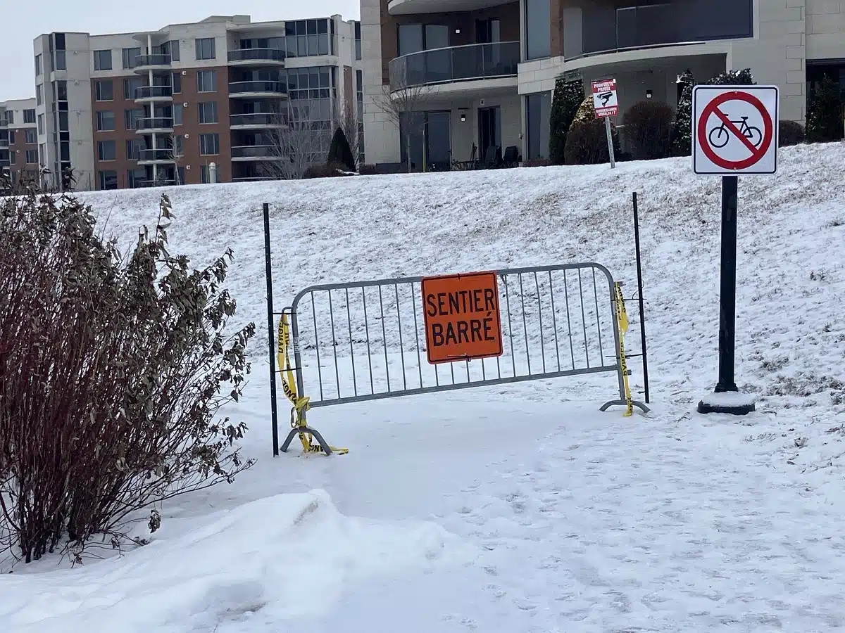 Lors d’une inspection du talus menée par la firme Englobe le 2 décembre 2025, des signes précurseurs de glissement ont été observés. À la suite de ces constats, des recommandations ont été transmises à la Ville. C’est pourquoi, par mesure de sécurité, une portion du sentier a été fermée; la zone concernée est clairement identifiée par des pancartes « Sentier barré ». Un chemin de détour est indiqué afin de permettre aux marcheurs de contourner cette zone, notamment via la rue Charcot.